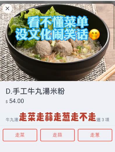 有網友點了一碗牛丸米粉,百般疑惑下選擇了走菜、走蔥、走蒜。