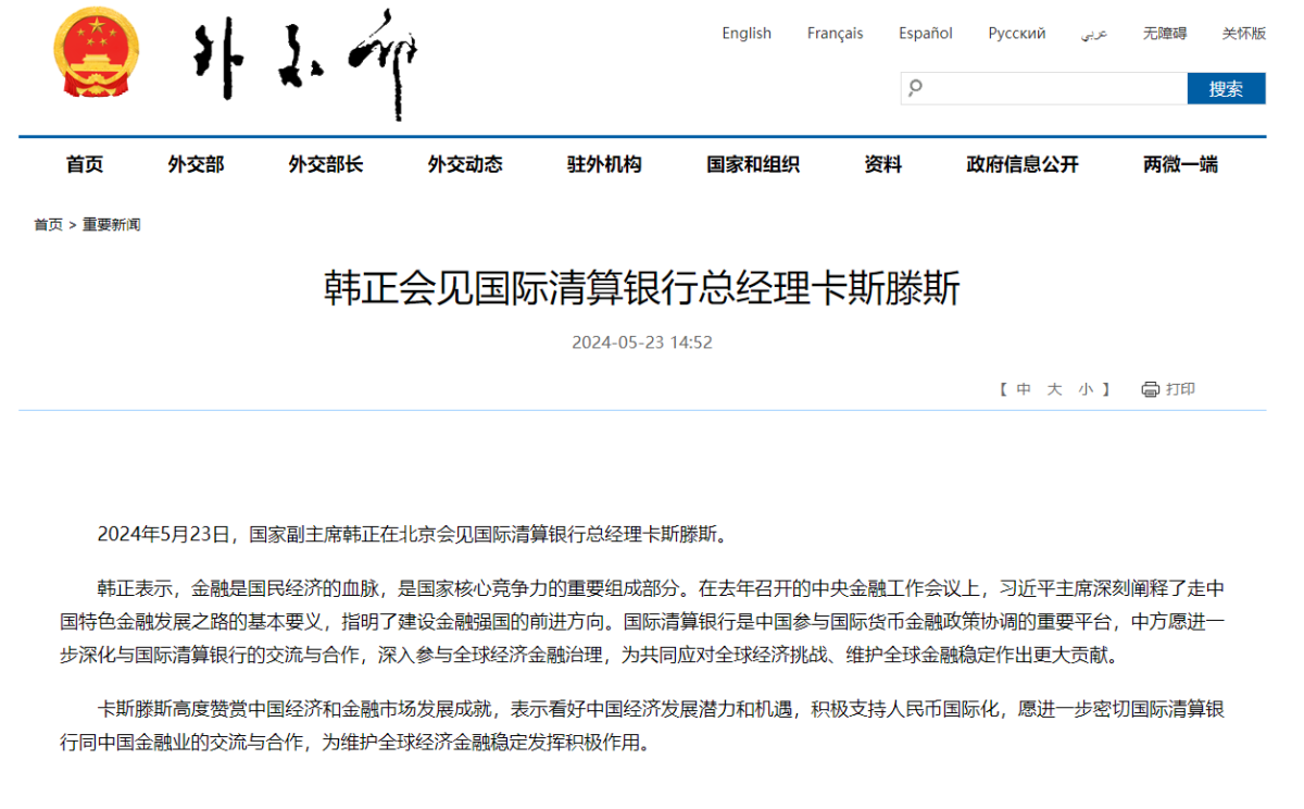 【點新聞報道】據外交部網站消息,5月23日,國家副主席韓正在北京會見國際清算銀行總經理卡斯滕斯。