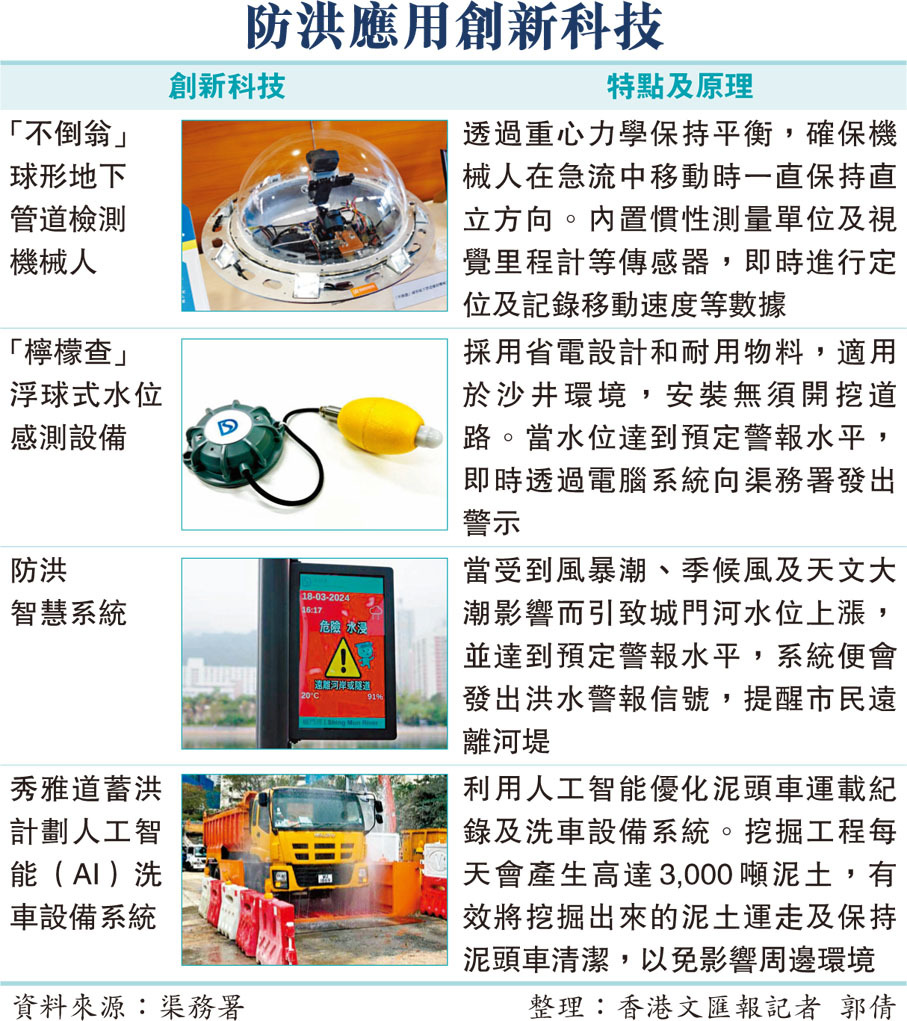 為更有效監測渠道狀況,署方引入多項創新科技處理防洪工作,其中在黃大仙及柴灣區,已選定逾30個雨水沙井,安裝「檸檬查」浮球式水位感測設備,24小時實時監測雨水渠的水位狀況。莫永昌指,安裝有關設備後,兩區在本月兩場紅雨中均沒有任何水浸報告。