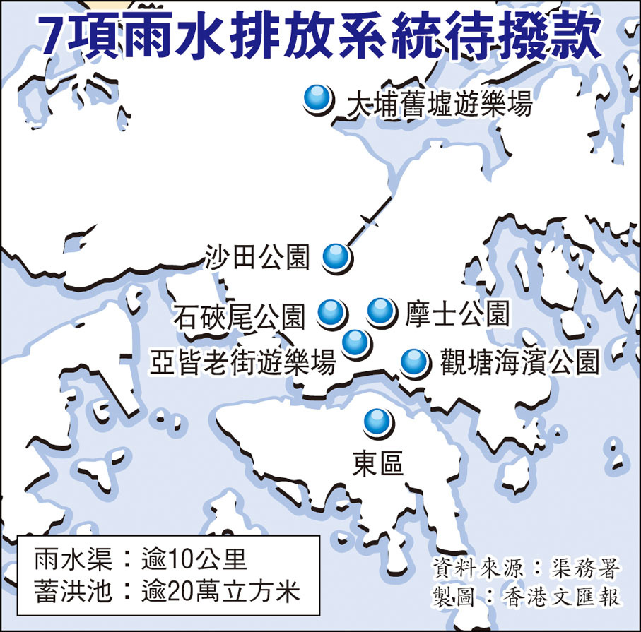同時,渠務署已針對有關水浸地點進行120項小型改善工程,大部分工程已於今年首季完成,涉及柴灣、黃大仙等曾嚴重受災地區。本月底政府將再向立法會申請撥款,進行7項雨水排放系統改善工程,令全港蓄洪池容量較現時增加一倍。而將來在設計防洪設施時,署方會繼續沿用一地多用理念。