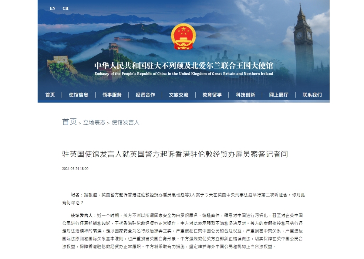 使館發言人:近一個時期,英方不斷以所謂國家安全為由羅織罪名、編造案件,肆意對中國進行污名化,甚至對在英中國公民進行任意抓捕和起訴,干擾香港駐倫敦經貿辦正常運作,中方對此表示強烈不滿和堅決反對。英方的虛假指控和惡劣行徑是對法治精神的褻瀆,是以國家安全為名行政治操弄之實,嚴重侵犯在英中國公民的合法權益,嚴重損害中英關係,嚴重違反國際法原則和國際關係基本準則,也嚴重損害英國自身形象。中方強烈敦促英方立即糾正錯誤做法,切實保障在英中國公民合法權益,保障香港駐倫敦經貿辦正常履職。中方將採取有力措施,堅定維護海外中國公民和機構正當合法權益。