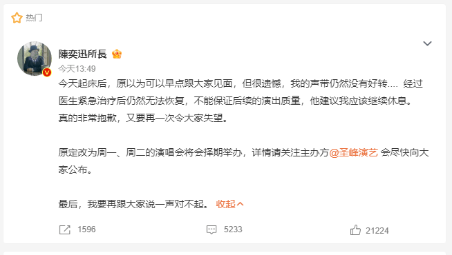 陳奕迅指原定在周一至二(27至28日)的兩場演唱會,將會擇日舉行。陳奕迅說:「今天起床後,原以為可以早點跟大家見面,但很遺憾,我的聲帶仍然沒有好轉……」他指經過緊急診治後,仍無法恢復狀態:「經過醫生緊急治療後仍然無法恢復,不能保證後續的演出質量,他建議我應該繼續休息。真的非常抱歉,又要再一次令大家失望。原定改為周一、周二的演唱會將擇期舉辦,詳情請關注主辦單位會盡快向大家公佈。最後,我要再跟大家說一聲對不起。」