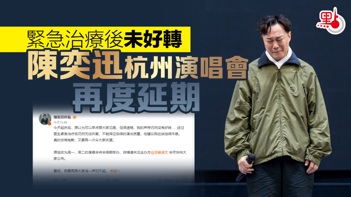 【點新聞報道】陳奕迅(Eason)的「FEAR AND DREAMS EASON CHAN IN CONCERT」巡迴演唱會,近日正在杭州舉行,24日剛滿100場。不料昨日(25日)開場前,陳奕迅突然以一身便服出場,含淚宣布因身體不適,今明兩場演唱會延期至27及28日。今日(26日)陳奕迅於社交平台微博發文,宣布演唱會要再度延期。