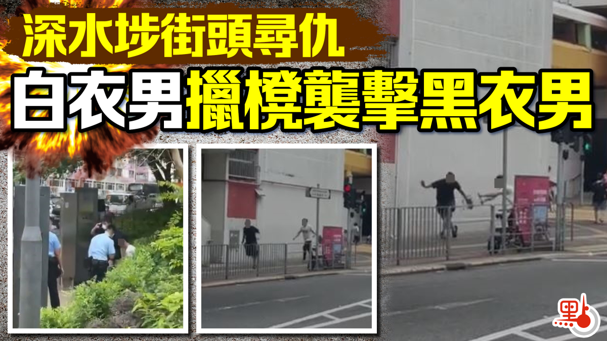 近日網上瘋傳一段影片,顯示一名白衣男在深水埗街頭,手持一張圓櫈襲擊一名黑衣男子,對方見狀隨即用手格擋,雙方交手數回後,黑衣男見機逃離現場。
