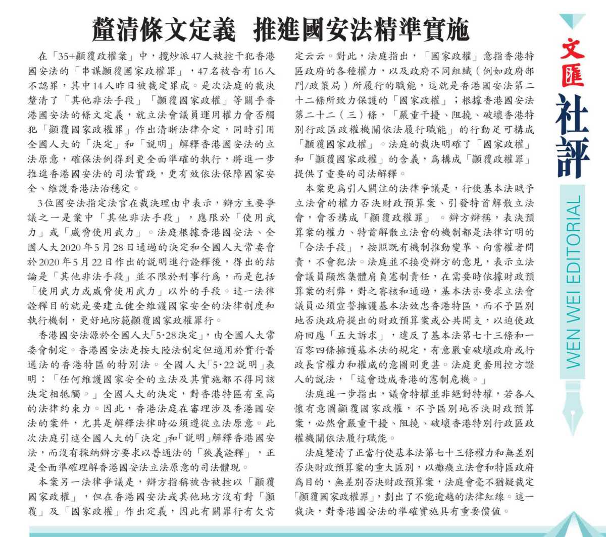 在「35+顛覆政權案」中,攬炒派47人被控干犯香港國安法的「串謀顛覆國家政權罪」,47名被告有16人不認罪,其中14人昨日被裁定罪成。是次法庭的裁決釐清了「其他非法手段」「顛覆國家政權」等關乎香港國安法的條文定義,就立法會議員運用權力會否觸犯「顛覆國家政權罪」作出清晰法律介定,同時引用全國人大的「決定」和「說明」解釋香港國安法的立法原意,確保法例得到更全面準確的執行,將進一步推進香港國安法的司法實踐,更有效依法保障國家安全、維護香港法治穩定。