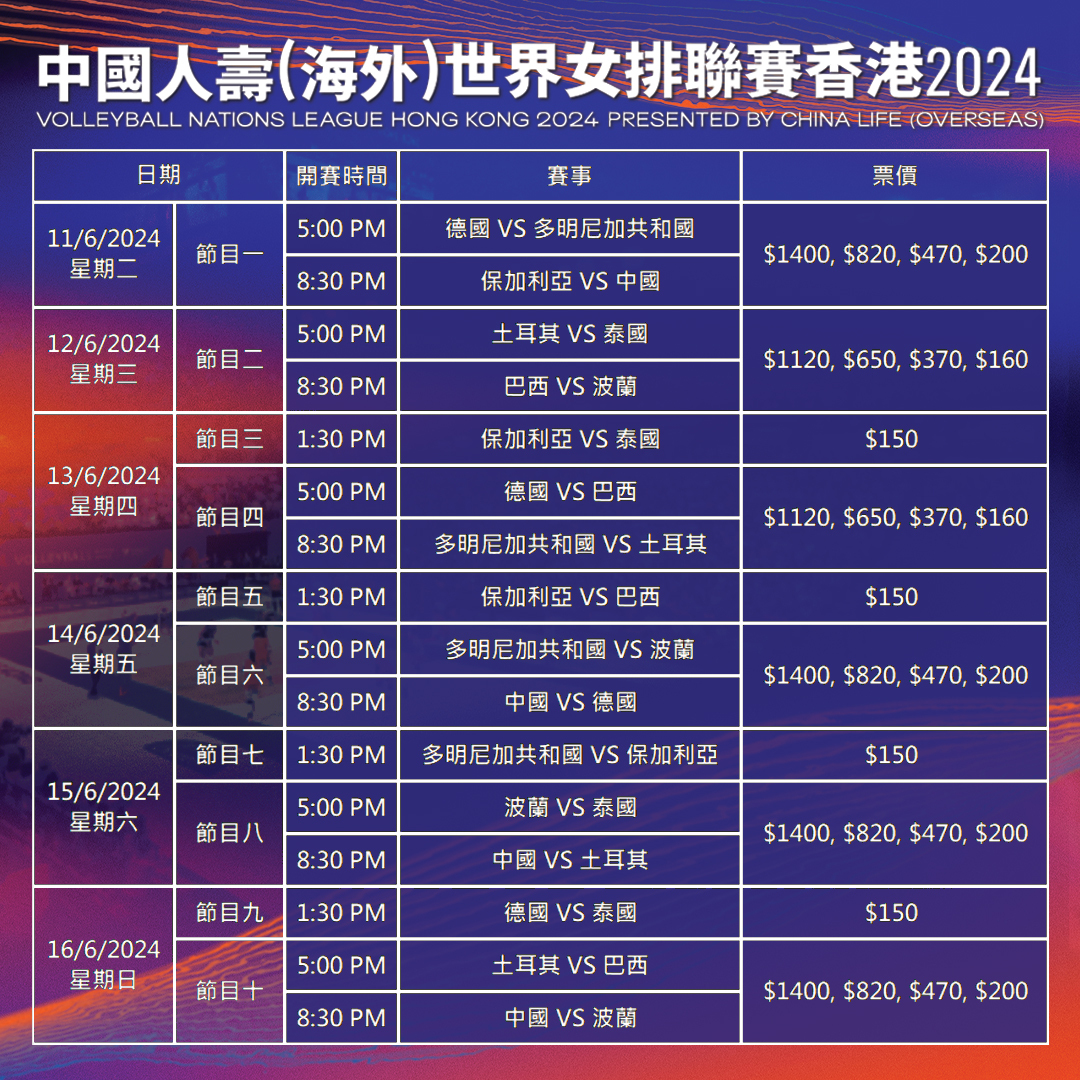 吳守基說,香港成功爭取繼續舉辦世界女排聯賽,屆時將有八支女子國家隊勁旅對陣,包括巴西、保加利亞、中國、多米尼加共和國、德國、波蘭、泰國及土耳其。他們將把握最後機會爭取巴黎奧運入場券。我們相信它將為球迷們呈現一場難忘的排球盛宴,亦展現香港的活力和熱情。