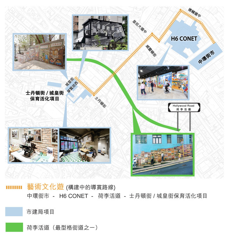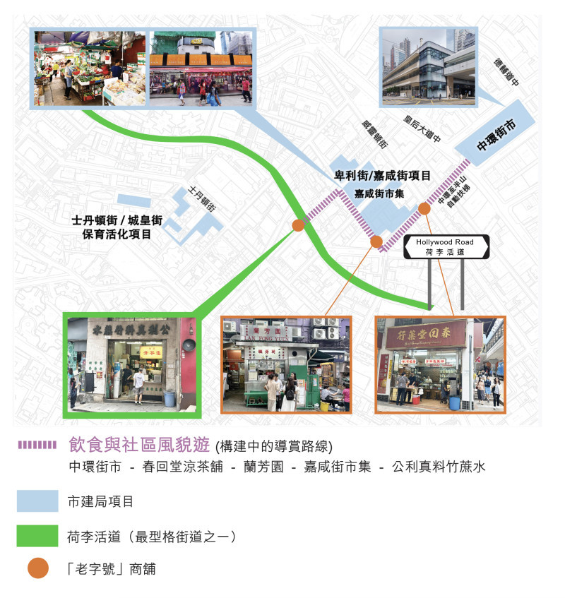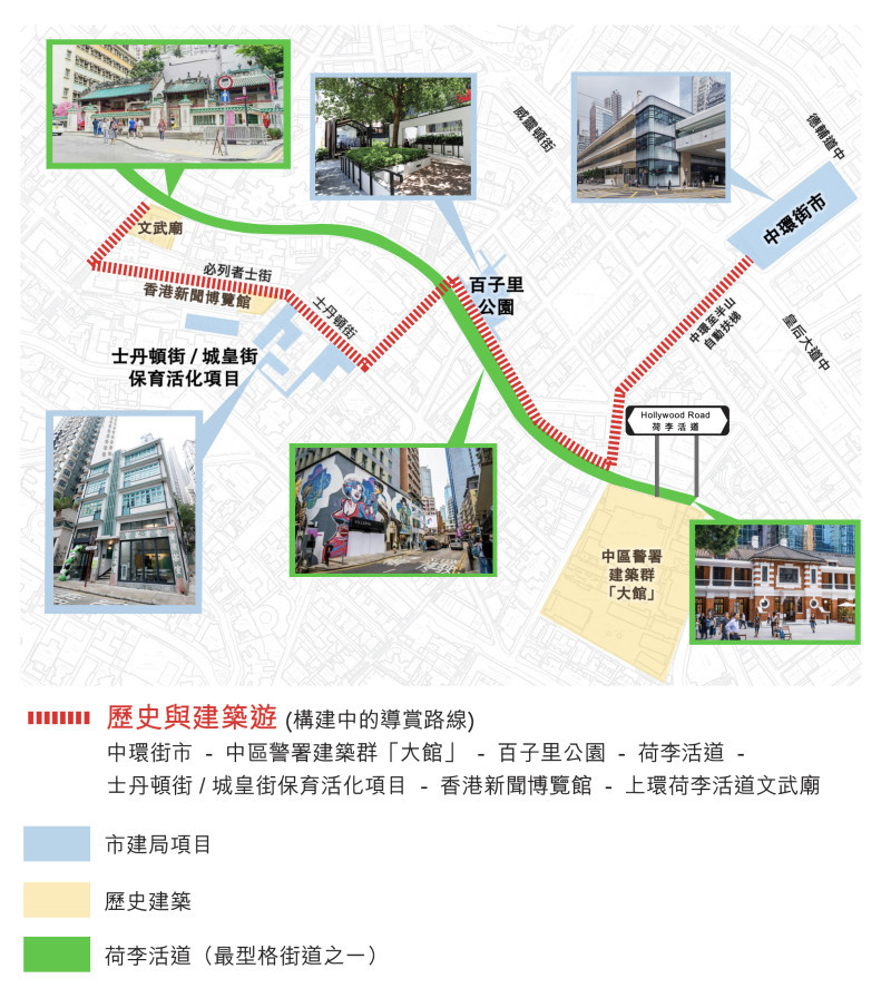 參觀路線:這條導賞路線會通過參觀區內一些具歷史意義的建築,讓參加者了解昔日香港居民的生活及文化。參觀景點包括:中環街市、大館、文武廟、元創方、香港新聞博物館,以及團隊在去年完成活化保育工作的士丹頓街項目等。在參觀中,導賞員會詳細講解建築特色以及市建局對此所做的保育活化工作。