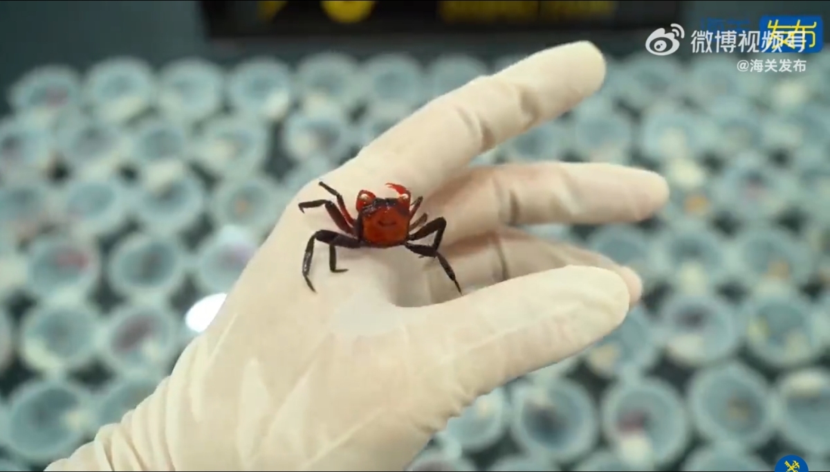 經拱北海關技術中心鑒定,該批活體蟹屬於吸血鬼蟹屬的6個物種,分別為香蕉吸血鬼蟹28隻、白手幽靈吸血鬼蟹20隻、番茄吸血鬼蟹13隻、紫色吸血鬼蟹13隻、彩虹吸血鬼蟹10隻、橙色吸血鬼蟹6隻。