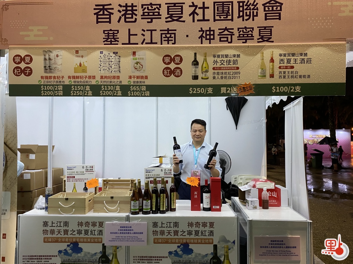 【點新聞報道】第二屆「同鄉社團家鄉市集嘉年華」一連五日在銅鑼灣維園舉辦,不少同鄉會把握這個一年一度的機會,將家鄉最優的特產推介給香港市民。香港寧夏社團聯會總幹事張嘉仁今日(3日)向點新聞記者表示,他們帶來寧夏最好的賀蘭山東麓葡萄酒,賀蘭山東麓與法國波爾多酒莊在同一緯度,是最適合葡萄生長的地方,該地的葡萄酒以口味純正、入口回甘著稱,堪稱中國以至全球最好的葡萄酒之一。除此之外,攤位還售賣灘羊、枸杞等寧夏特色商品,深受本地消費者的歡迎。