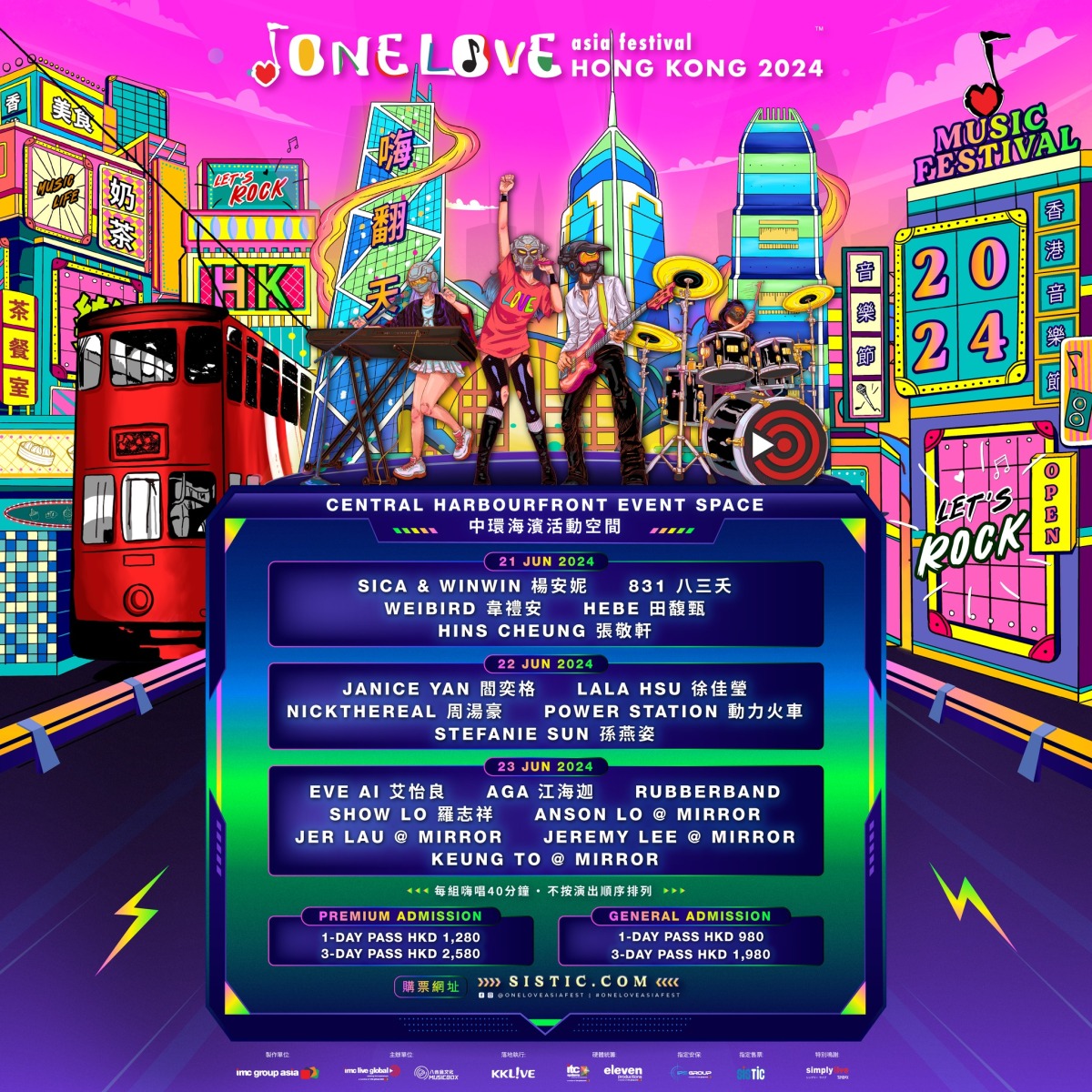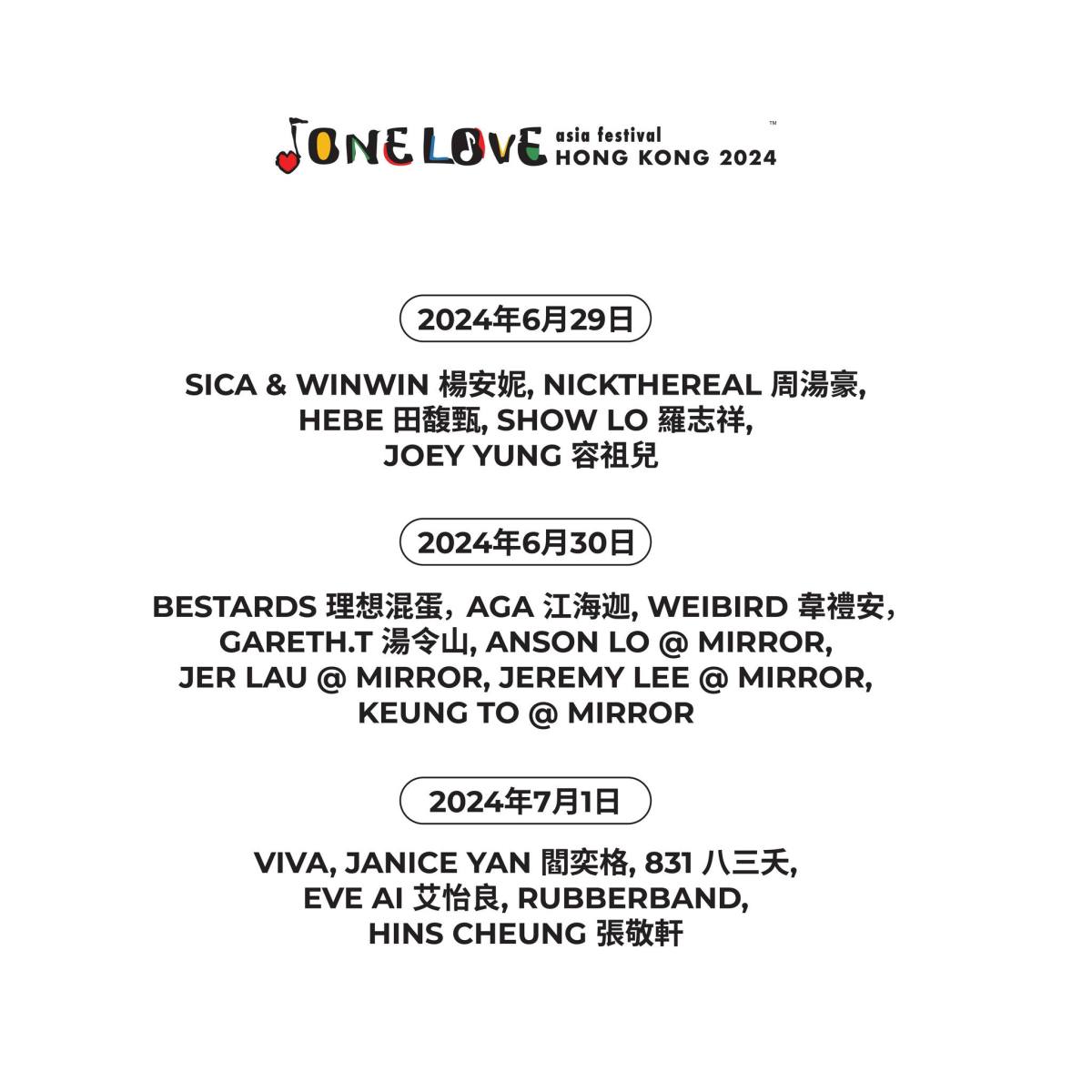 被稱為亞洲最大型音樂盛事的「One Love Asia Festival」今年首次登陸香港站,主辦單位為新加坡IMC Live Global。香港站演出三場,本月21至23日一連3日在中環海濱舉行,每日有不同著名歌手接棒演出,包括亞洲天后孫燕姿、金曲歌后田馥甄Hebe和徐佳瑩LaLa、組合動力火車、羅志祥、韋禮安、八三夭831,本地方面則有歌手張敬軒、男子組合MIRROR姜濤、Anson Lo(盧瀚霆)、Jer(柳應廷)及Jeremy(李駿傑)等。門票已於今年4月公開發售,單日票980元、1280元,3日套票1980元、2580元。