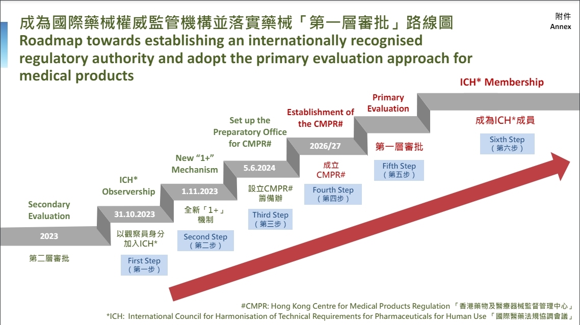 衞生署表示,特區政府會繼續積極跟進,包括正式成立「藥械監管中心」及落實藥械的「第一層審批」。去年10月31日,香港成為「國際醫藥法規協調會議」(ICH)觀察員,使香港可以掌握藥物監管最新發展並推進本港藥物監管制度,進一步與世衞列明規管機構看齊。按國際經驗,從參與ICH工作到正式成為ICH監管機構成員一般需時約8至10年。同年11月1日,全新「1+」新藥審批機制正式實施,衞生署已收到近70間藥廠超過210個查詢,當中包括許多海外及內地藥廠;在新機制下,兩款治療癌症的新藥申請獲批。