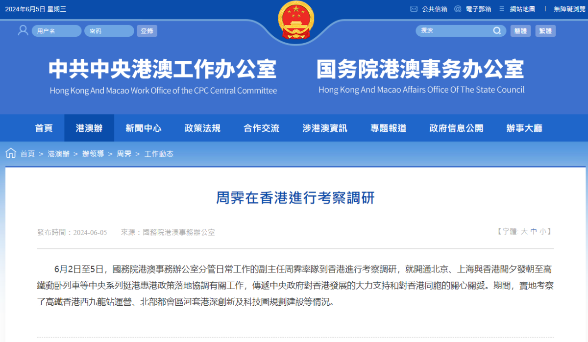 【點新聞報道】據國務院港澳事務辦公室網站消息,6月2日至5日,國務院港澳事務辦公室分管日常工作的副主任周霽率隊到香港進行考察調研,就開通北京、上海與香港間夕發朝至高鐵動臥列車等中央系列挺港惠港政策落地協調有關工作,傳遞中央政府對香港發展的大力支持和對香港同胞的關心關愛。期間,實地考察了高鐵香港西九龍站運營、北部都會區河套港深創新及科技園規劃建設等情況。