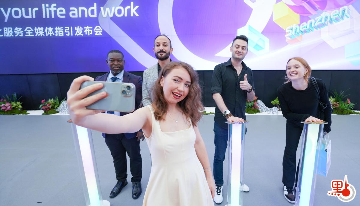 此次發布會現場科技感滿滿,EyeShenzhenAI數字人主播Alvin擔任司儀。在他的介紹下,俄羅斯姑娘瑪麗娜登場,和扮演EyeShenzhen Chatbot的優必選機器人微笑握手、自拍。這標誌着深圳外籍人士便利化服務全媒體指引的正式發布,也為「新深圳人」瑪麗娜的精彩生活揭開了序幕。