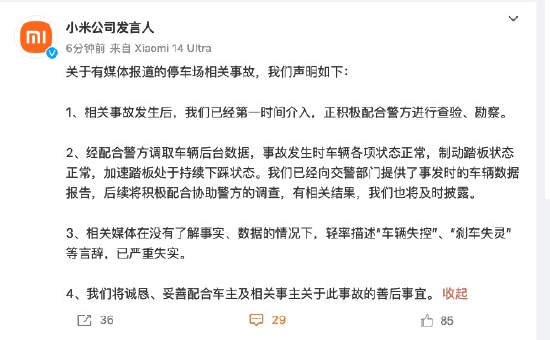 小米公司今日發文回應相關事故,指經配合警方調取車輛後台數據,事故發生時車輛各項狀態正常,制動踏板狀態正常,加速踏板處於持續下踩狀態。後續將積極配合協助警方的調查,有相關結果,公司也將及時披露。