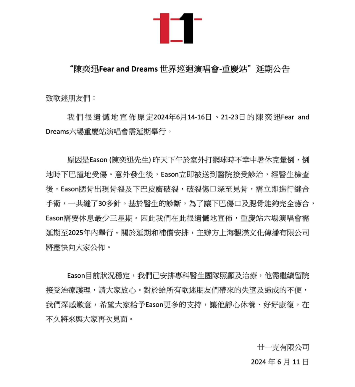陳奕迅所屬的廿一克有限公司發表聲明,指陳奕迅昨天(10日)下午於室外打網球時不幸中暑休克暈倒,倒地時下巴撞地受傷。意外發生後,Eason立即被送到醫院接受診治,經醫生檢查後,Eason腮骨出現骨裂及下巴皮膚破裂,破裂傷口深至見骨,需立即進行縫合手術,一共縫了30多針。基於醫生的診斷,為了讓下巴傷口及腮骨能夠完全癒合,Eason需要休息最少三星期。因此很遺憾地宣布,重慶站六場演唱會需延期至2025年內舉行。關於延期和補償安排,主辦方上海觀渼文化傳播有限公司將盡快向大家公布。