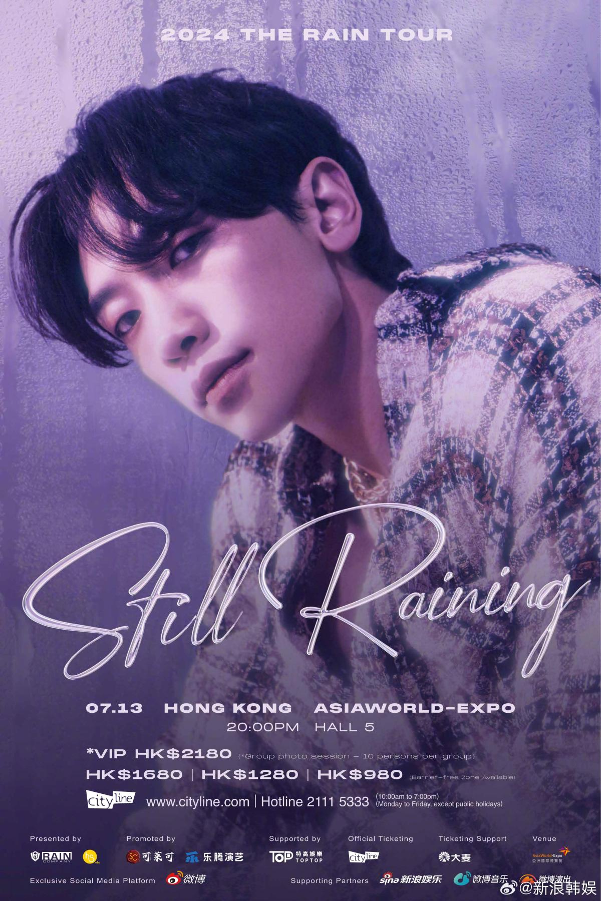 【點新聞報道】韓流天王Rain(鄭智薰)相隔8年舉行個人巡迴演唱會《2024 THE RAIN TOUR:STILL RAINING》。早前Rain來港出席活動時,已親自預告7月份會來港開騷,現正式宣布《2024 THE RAIN TOUR:STILL RAINING—HONG KONG》香港站落實於今年7月13日(星期六),假香港亞洲國際博覽館Hall 5舉行。門票下周四(20日)起公開發售。