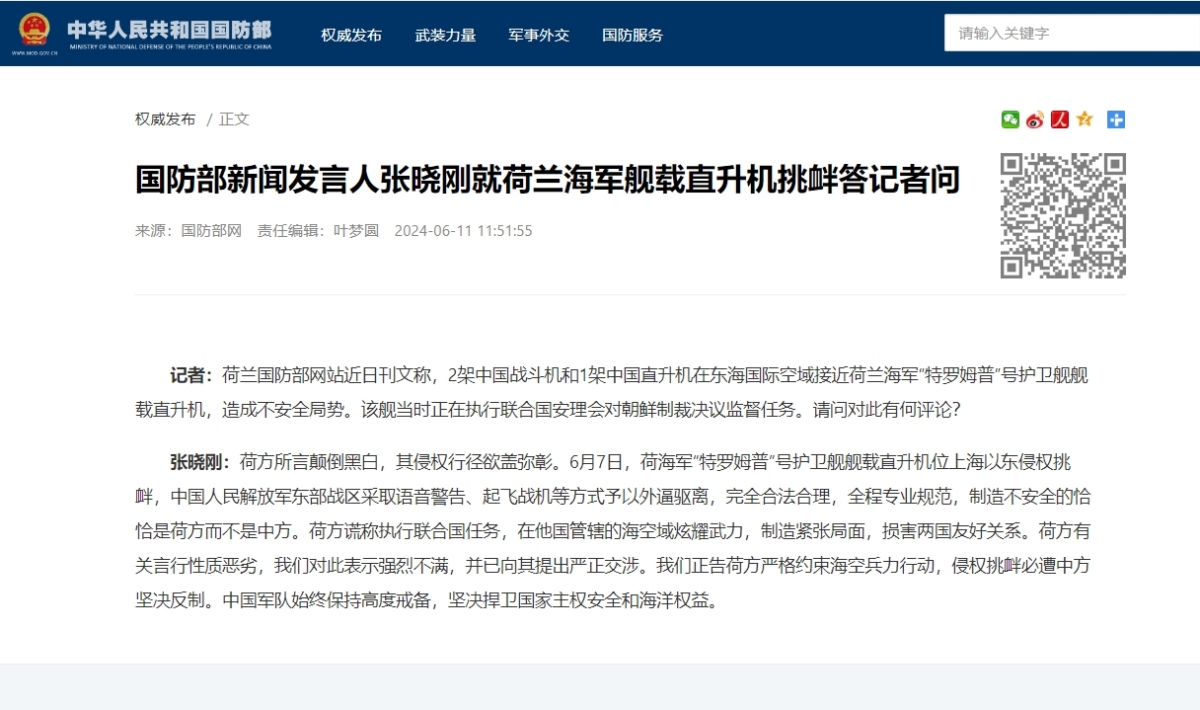 張曉剛:荷方所言顛倒黑白,其侵權行徑欲蓋彌彰。6月7日,荷海軍「特羅姆普」號護衛艦艦載直升機位上海以東侵權挑釁,中國人民解放軍東部戰區採取語音警告、起飛戰機等方式予以外逼驅離,完全合法合理,全程專業規範,製造不安全的恰恰是荷方而不是中方。荷方謊稱執行聯合國任務,在他國管轄的海空域炫耀武力,製造緊張局面,損害兩國友好關係。荷方有關言行性質惡劣,我們對此表示強烈不滿,並已向其提出嚴正交涉。我們正告荷方嚴格約束海空兵力行動,侵權挑釁必遭中方堅決反制。中國軍隊始終保持高度戒備,堅決捍衛國家主權安全和海洋權益。