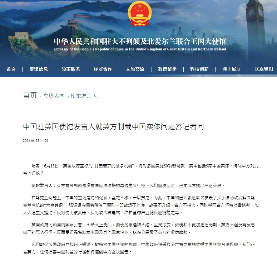 【點新聞報道】據中國駐英國大使館網站消息,6月13日,中國駐英國使館發言人就英方制裁中國實體問題答記者問。有記者問到,英國政府今日宣稱為「打擊普京的戰爭機器」,將對多國實施50項新制裁,其中包括5家中國實體。請問中方對此有何評論?