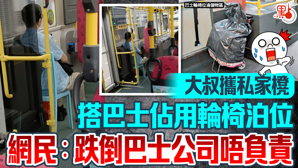 為了推動關愛共融,1輛巴士設有至少1個輪椅泊位,方便輪椅人士乘車。惟網上近日流傳2張照片,顯示有大叔攜「私家櫈」登上九巴,霸佔輪椅停放處的空間變成「私家位」安坐,表現悠然自得,因當時沒有坐輪椅的乘客,故貌似沒有阻礙到其他乘客。網民紛紛留言,有人認為沒有阻礙他人就沒問題,亦有人猜測大叔可能剛買了櫈,又指「咁都得,笑死」、「有傷殘人士時就唔好啦」;不過,亦有網民認為坐「私家櫈」恐有危險,「跌倒巴士公司唔負責」。