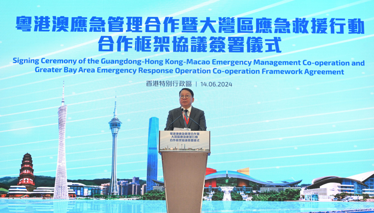 【點新聞報道】《粵港澳應急管理合作暨大灣區應急救援行動合作框架協議》簽署儀式今日(14日)下午在紀律部隊人員體育及康樂會舉行。應急管理部副部長徐加愛和中央港澳工作辦公室室務會成員向斌出席儀式。儀式由廣東省常務副省長張虎、香港特別行政區政務司司長陳國基和澳門特別行政區保安司司長黃少澤見證。《合作框架協議》由廣東省應急管理廳廳長王再華、保安局局長鄧炳強和澳門警察總局局長梁文昌簽署。
