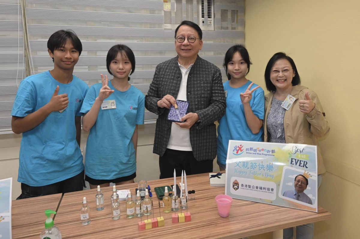 陳國基又向「仔仔女女」學習了製作手工藝品,包括擴香石、乳霜、香水、永生花擺設等,他特別欣賞學員們精靈活潑、對答流利。此外,陳國基鼓勵一眾學員藉着父親節這個大日子,對一直辛勤努力工作、照顧家庭的父親表達謝意。