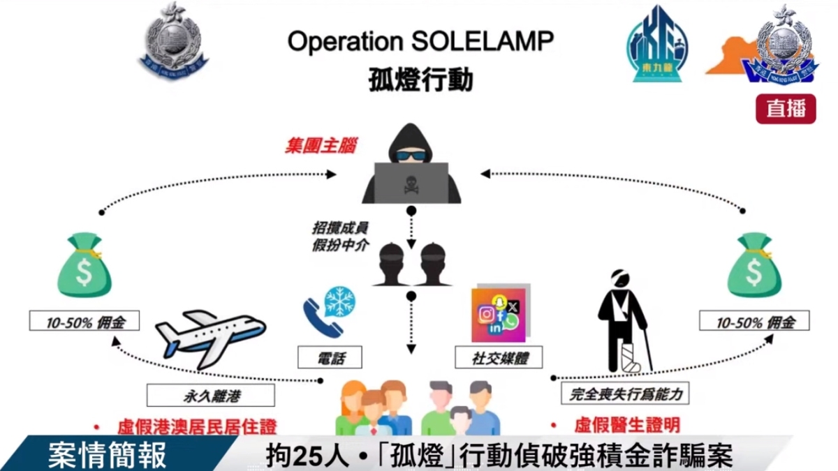 【點新聞報道】警方於6月11至14日進行「孤燈」(SOLELAMP)行動,偵破一宗強積金詐騙案件,並以「詐騙」及「使用虛假文書」罪拘捕18男7女,年齡介乎26至58歲,包括強積金供款人、中介人及經紀,涉款約570萬元。警方今日(17日)對案情作簡報。