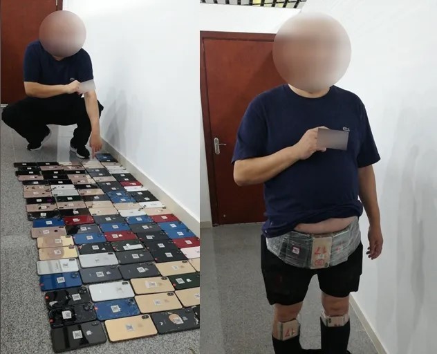 據「海關發布」微信公眾號公布,6月9日,拱北海關所屬閘口海關在拱北口岸查獲一名旅客綁藏手機100部進境。事發當日上午9時30分許,身穿深色短袖、寬鬆長褲的男子曾某經拱北口岸旅檢大廳海關「無申報通道」進境。從海關公布的短片可見,涉事男子身材「壯碩」,惟現場關員察覺該男子腰腹處有異常隆起,且步伐沉重、身體僵硬,遂將其截查。經進一步檢查,關員從該男子腰腹處、雙腿大腿、小腿處查獲大量用塑料薄膜綁纏的舊手機,共計100台。