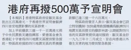 賽馬會捐出10億港幣,社會各界募捐1880萬港幣,光是特區政府當年就撥捐了過百億賑災資金!
