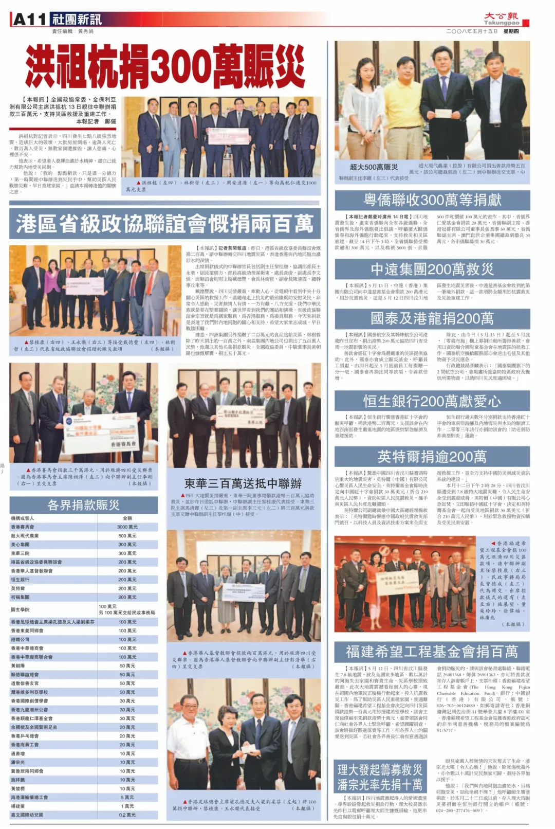 香港各行各業也都在以自己的方式為災區加油:滙豐銀行開始等額捐款,市民捐1元,銀行捐1元;上百名藝人同台籌款2億多港幣。