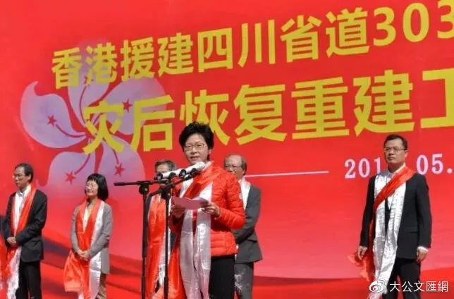 2016年5月11日,時任政務司司長林鄭月娥主持香港援建四川省道303線映秀至臥龍公路災後恢復重建工程貫通儀式。