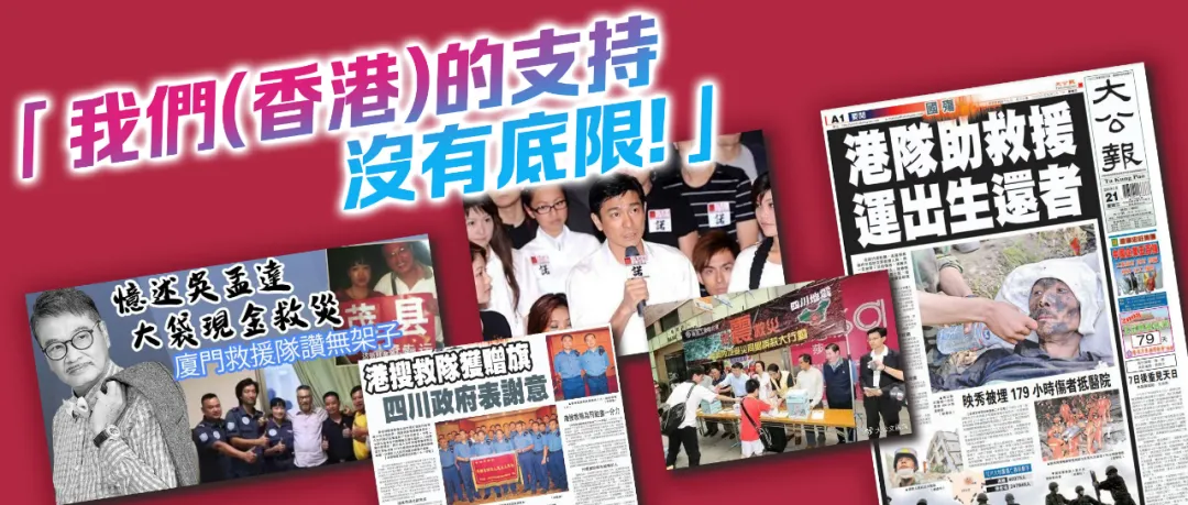猶記得2008年汶川地震後,香港媒體對災情進行了長達2個月的連續報道,報道裏說過一句話:我們(香港)的支持沒有底限!