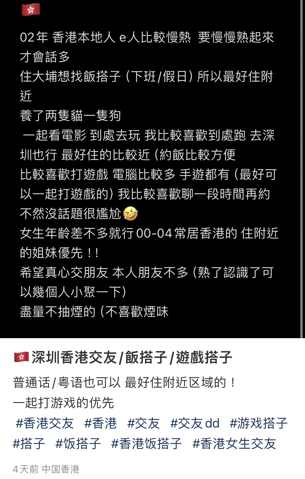 【點新聞報道】「港漂找搭子,吃飯、逛街、爬山、演唱會、學粵語⋯⋯」在小紅書等網絡平台上,「找搭子」已經在港漂年輕人間形成了一股潮流。無論是爬山、演唱會等短期娛樂活動,還是逛街、拍照等休閒活動,亦或是吃飯這樣的日常活動,都能搜索到尋找「搭子」的帖子。