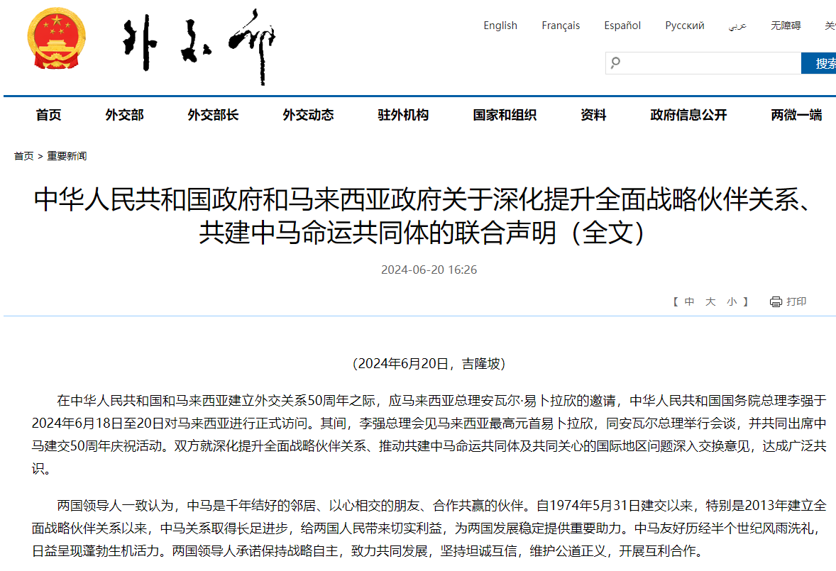 【點新聞報道】6月20日,中國和馬來西亞發表《中華人民共和國政府和馬來西亞政府關於深化提升全面戰略夥伴關係、共建中馬命運共同體的聯合聲明》。