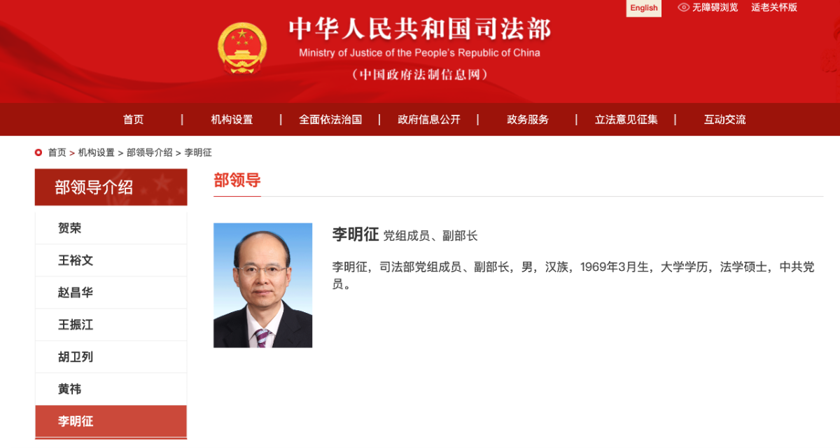 據司法部官網更新顯示,李明征已經出任司法部黨組成員、副部長。李明征,1969年3月出生,大學學歷,法學碩士。他曾在國務院法制辦公室任職,歷任秘書行政司秘書處處長、秘書行政司副司長。2007年7月,他轉任陝西省商洛市委常委、副市長。近年來,李明征一直在司法部任職。公開報道顯示,他曾任司法部法治調研局局長、立法二局局長等。