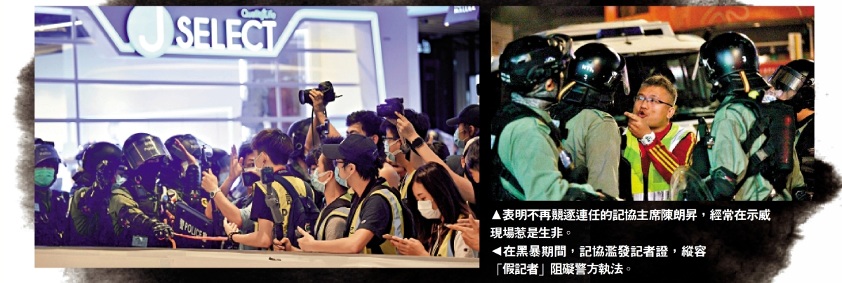 - 2019年黑暴期間記協屢屢縱容「假記者」阻礙警方執法,更本末倒置多次公開批評警方打壓新聞自由。2020年5月,攬炒派發起在全港多個商場非法聚集,防暴警員截查一名年僅12歲姓陸的初中生,他正穿着記者反光衣及進行拍攝,聲稱為深學媒體的「學生義務記者」。事件引起市民批評記協為達到其政治目的,不顧學童的人身安全。