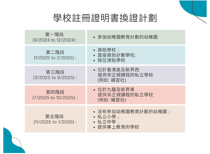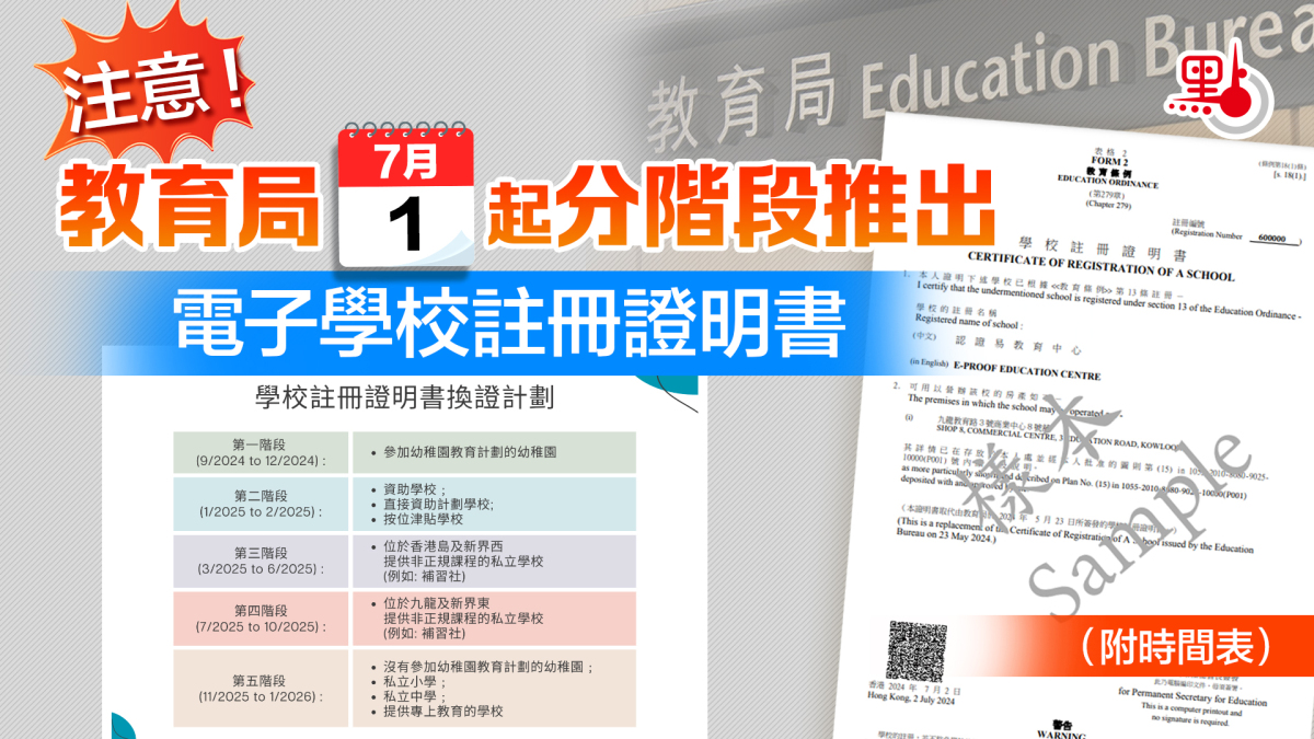 至於現時已持有紙本證明書的學校,教育局9月起將分階段安排它們免費換領電子學校註冊證明書,學校屆時會收到教育局的信函通知換證。學校無需申請。更多信息可參考教育局網頁。