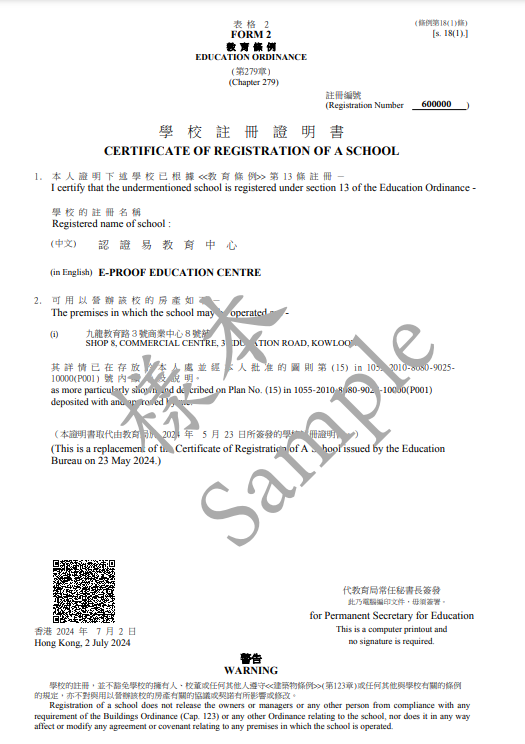 電子和紙本學校註冊證明書具有同等法律地位,載列相同資料,即註冊編號、學校名稱和地址、簽發日期、有效限期(如適用)和教育局負責人員的簽署。學校須展示電子註冊證明書的打印本,展示方式與紙本安排相同。