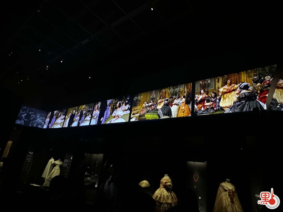 至於男裝,在一個多世紀以來,並無太多變化,一般男性在白天會穿着三件套禮服,晚上則穿燕尾服。記者在逛展過程中,發現策展方會在不同年代的服飾展區,同步播放描摹當下時代的電影畫面,給人沉浸的參觀感受。