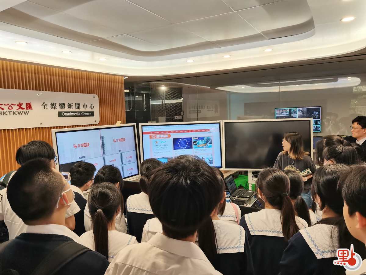除了學習紙媒製作流程和歷史之外,同學們還到全媒體中心參觀,了解主播組、國際新聞部等新媒體單位的採編工作。全媒體助理總編輯(融媒工作部)陶亮向同學講解《點觀香港》數字人主播、新媒體平台矩陣等嶄新技術,又協助他們分組扮演主持人、受訪者、策劃、攝像等角色,體會製作節目的策劃、攝製、剪輯、運營及製片過程。