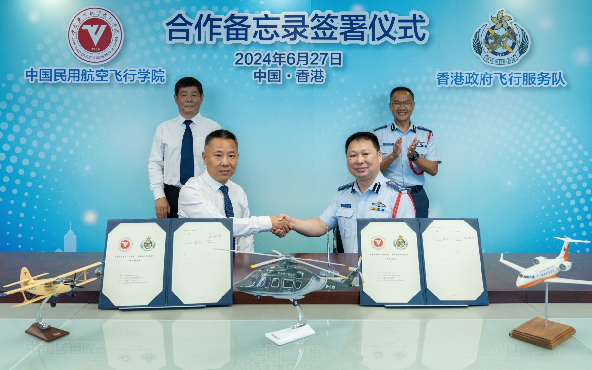 合作備忘錄由飛行服務隊總機師(訓練及標準)黃耀康機長和中飛院廣漢分院院長葛志斌簽署,並由飛行服務隊總監胡偉雄機長和中飛院副院長歐陽霆見證簽署儀式。