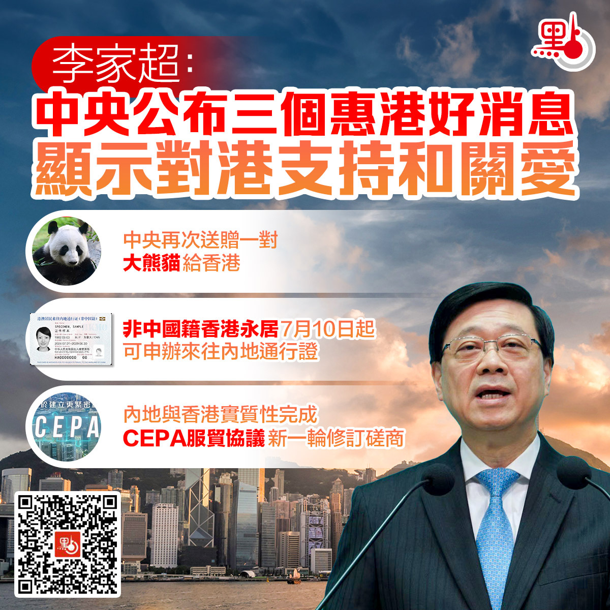 李家超感謝中央為香港帶來三項惠港措施。第一,是中央再次送贈一對大熊貓給香港。特區政府已經和國務院港澳辦和國家林業和草原局展開了對接工作,商討大熊貓來香港的安排,包括檢疫的要求等等。政府代表團稍後會前往四川商討籌備工作,政府會在適當的時候公布細節。