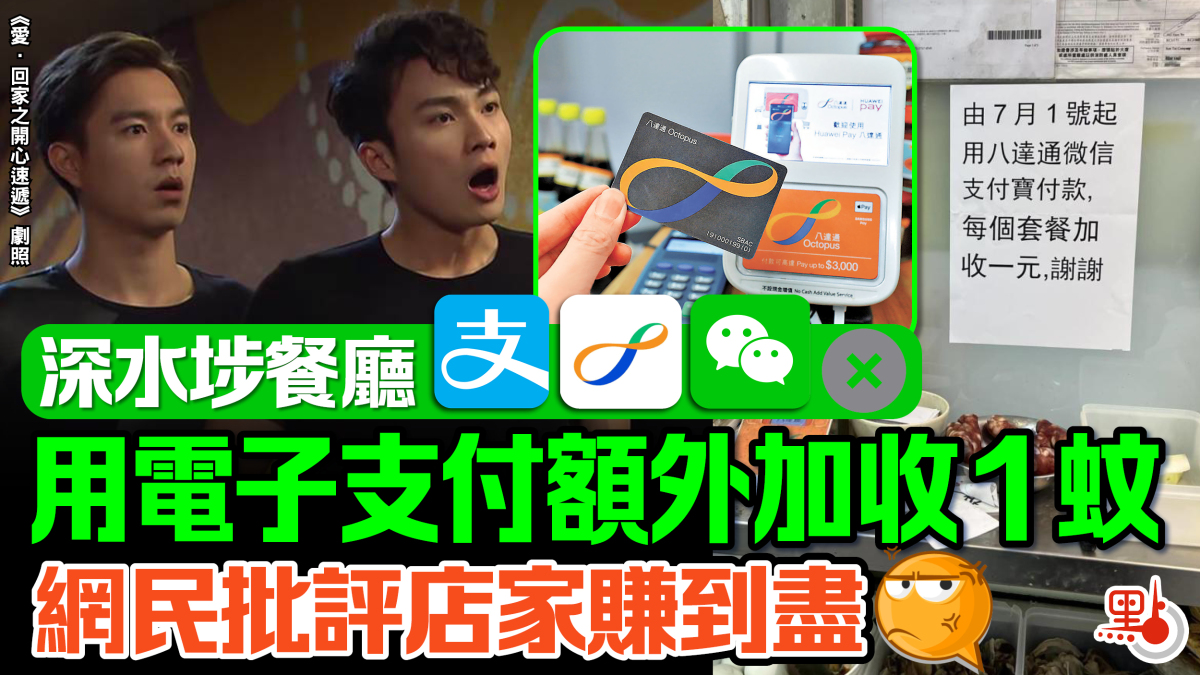 再有餐廳向使用電子支付的食客收取額外費用。日前有網民發文指,深水埗一間餐廳貼出告示,7月1日起以電子支付結賬,每個套餐加收一元。帖文引起網民熱議,有人批評店家慳皮打算賺到盡,有人更質疑餐廳收取費用已違八達通協議,建議作出投訴。