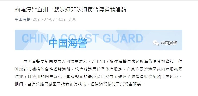 【點新聞報道】據「中國海警」消息,中國海警局新聞發言人劉德軍表示,7月2日,福建海警位泉州近海依法登檢查扣一艘涉嫌非法捕撈的台灣省籍漁船。