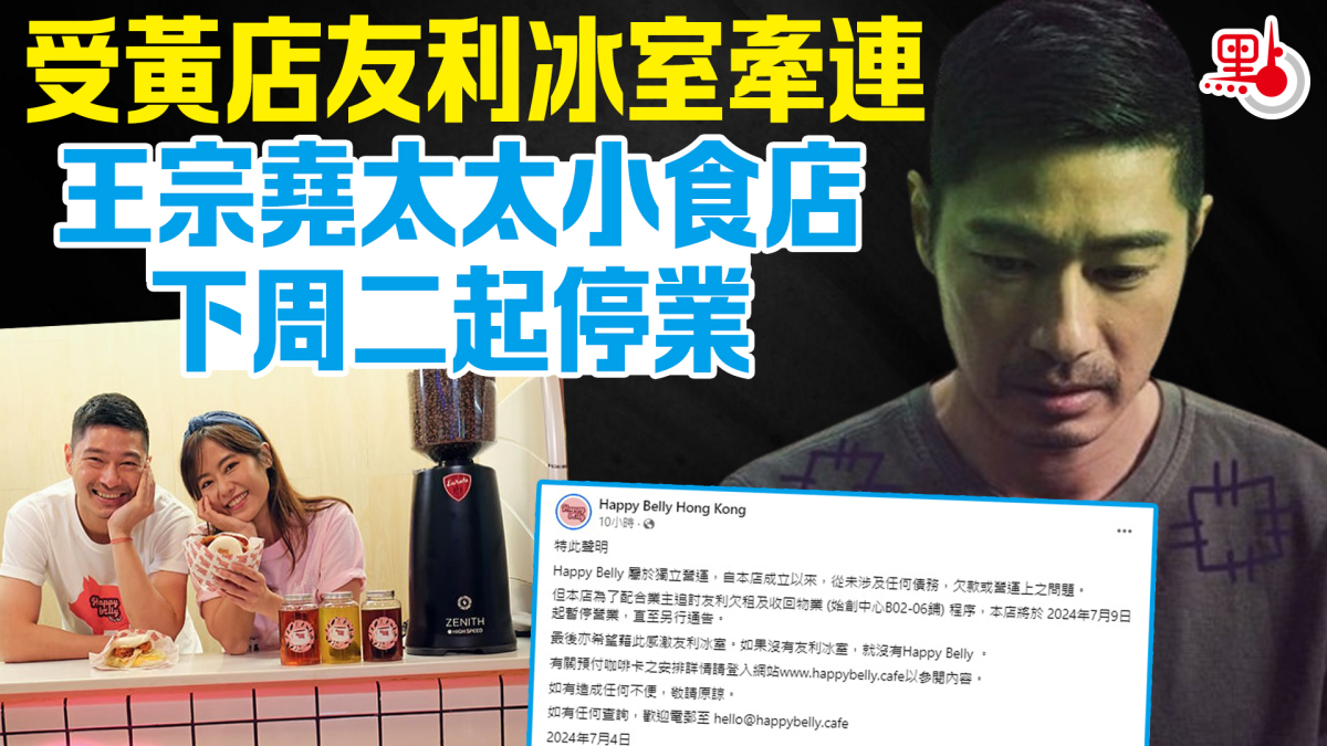 藝人王宗堯年初因2019年七一衝擊立法會案被控暴動罪成立,三月中被判囚6年2個月。他與太太開設的小食店Happy Belly昨日發聲明指,為配合業主追討友利冰室欠租及收回物業的程序,從9日起暫停營業。