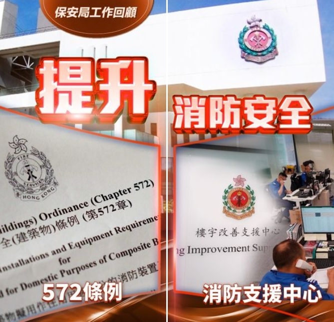 鄧炳強發布保安局工作回顧消防安全篇,指提升消防安全一直是社會關注的議題,特別是舊式樓宇的消防安全,所以保安局已於2022年9月完成修訂《消防安全(建築物)條例》的公眾諮詢,而消防處亦於去年年尾正式成立「消防處樓宇改善支援中心」,為舊樓業主就提升樓宇安全提供一站式支援服務。