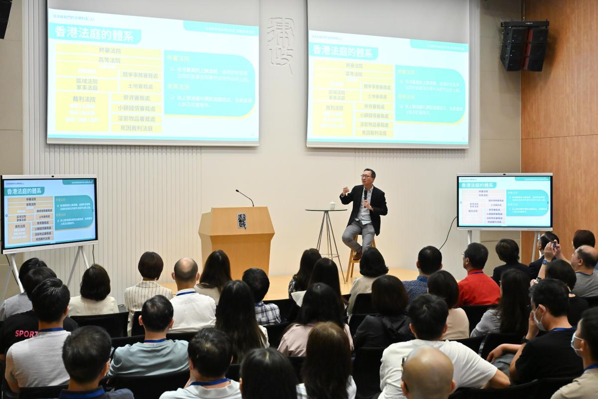 林定國其後就「法治與我們的法律制度」課題主講,向學員闡述法治的基本內涵、概述香港法律制度與香港法院體制的內容,以及講解法治與憲法、基本法、《香港國安法》、《維護國家安全條例》和「一國兩制」的關係。林定國希望透過本次課程,提升教師對於香港法治和普通法制度的認識,以及對於不同法律的理解,增強他們日後教授有關內容時的信心。