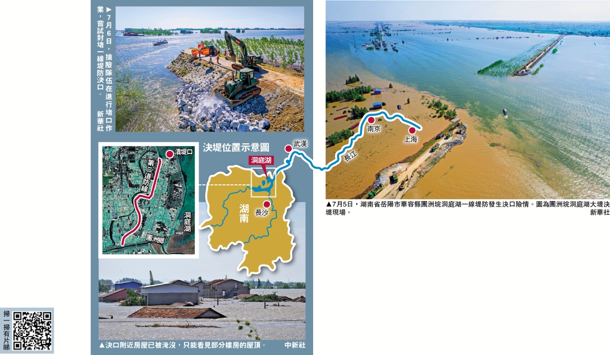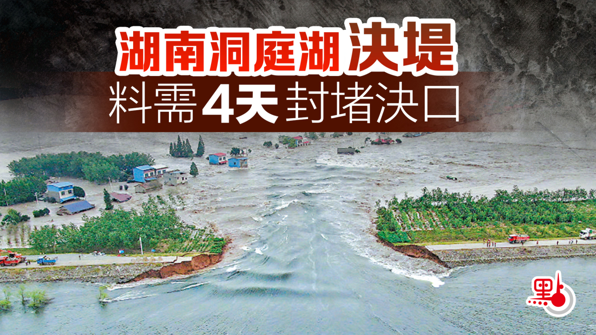 大公報綜合記者姚進、新華社、央視新聞報道:自6月16日開始,湖南遭遇今年以來最強降雨,內地第二大淡水湖洞庭湖水位持續上漲。5日16時許,湖南省岳陽市華容縣團洲鄉團北村團洲垸洞庭湖一線堤防發生管湧險情,17時48分許,緊急封堵失敗後堤壩決堤。據了解,團洲鄉一線防洪大堤長20.8公里,是華容、君山的第一道屏障,有「湖南第一險」之稱。