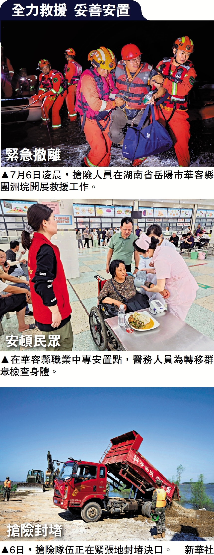 出現險情後,湖南省委、省政府高度重視,要求省防指和岳陽市迅速組織處置、封堵,全力轉移垸區群眾,堅決確保人民群眾生命安全。湖南省、岳陽市累計調度各類救援人員2300餘人,出動160多艘衝鋒舟,有序撤離華容縣團洲垸群眾5755人,未出現人員傷亡。