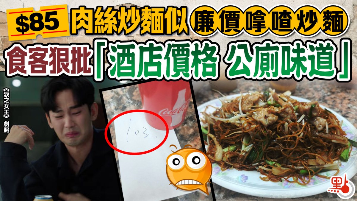食炒麵都中伏!有食客在討論區大呻,日前光顧西環某馳名煲仔飯的餐廳,點了一碟要價85元的肉絲炒麵,但上枱時卻是碟「豉油皇肉絲炒麵」,食落口還要「又淋又油又碎」。他並發現餐廳早餐時段有供應豉油皇炒麵,估計「我呢碟分分鐘係朝早賣剩,加幾條肉絲翻炒幾下」,另加飲品後埋單合共103元,批評是「酒店價格,公廁味道」,不少網民都認為餐廳做法離譜。