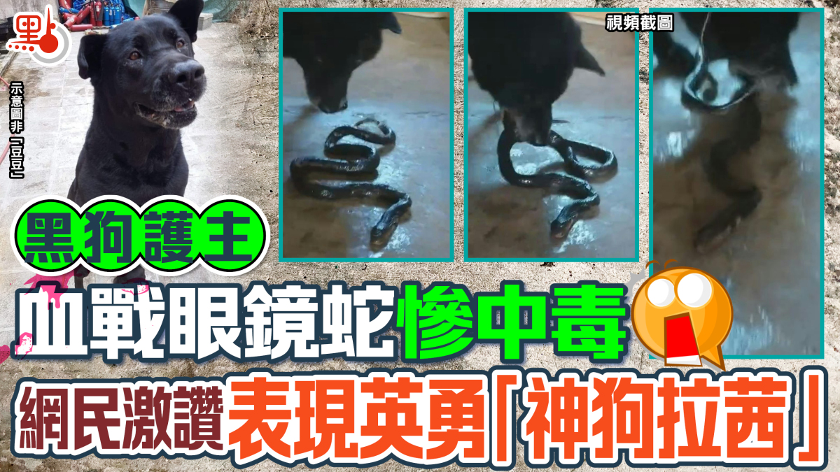 狗狗對主人可謂是忠心耿耿,甚至在關鍵時刻能與主人同生死共患難。有港男在網上發布影片,顯示其家中黑狗血戰眼鏡蛇,將大蛇咬到奄奄一息。然而,黑狗亦在大戰中中毒,幸得動物保護組織「流浪狗之家」幫助治理,黑狗現已無大礙。